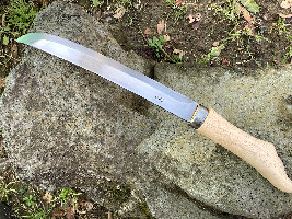 ●鋼の上に極軟鋼を載せて鍛接する方法です。刃向きが利き手に7:3に傾いているので半諸刃とも言われています。渓流、キャンプ,山菜取りなど様々な分野で活用できる山鉈です。